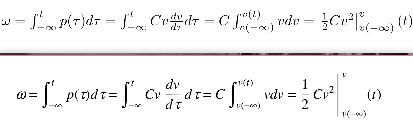 \omega = \int_{-\infty}^{t} p(\tau)d\tau = \int_{-\infty}^{t} Cv {dv \over d\tau}d\tau = C \int_{v(-\infty)}^{v(t)} vdv = \left.{1 \over 2}Cv^{2} \right \vert_{v(-\infty)}^v(t)